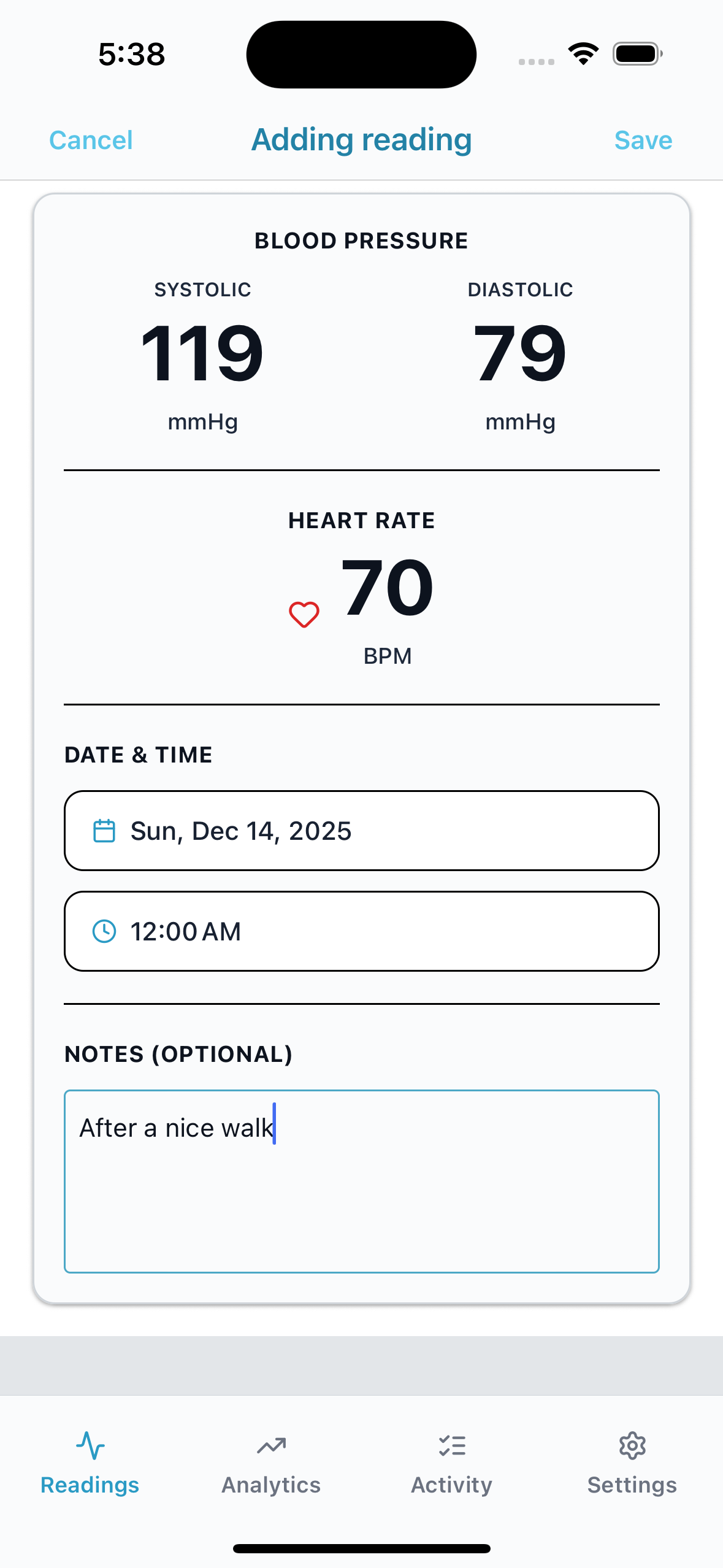 Log your blood pressure readings in seconds. Quick, simple, and designed for daily use without the hassle.