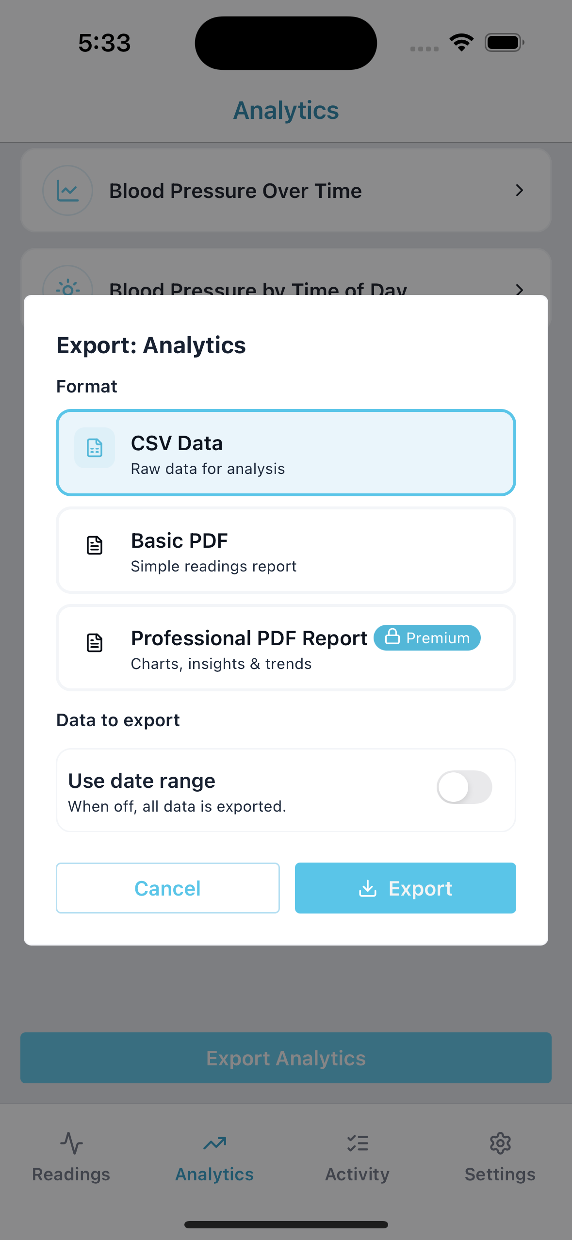 Export your complete blood pressure history as a professional report to share with your doctor for better care.